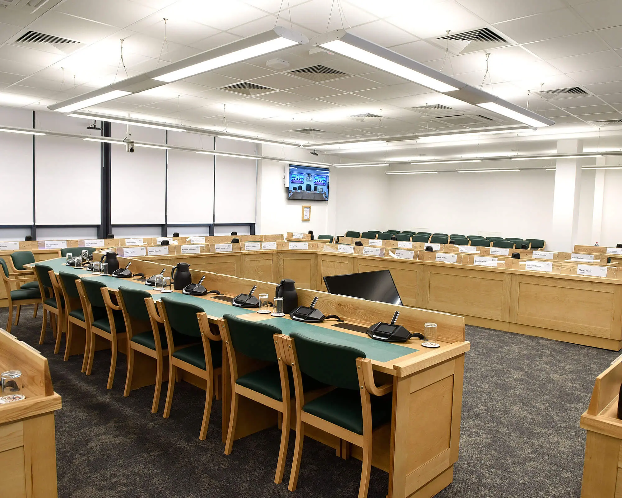 From bespoke seating and benches to matching tables and lecterns. Ensuring balance of the borough’s heritage with the functional needs of a modern democratic space. The result is a purpose-built chamber that integrates civic character, durable materials and clean sightlines, with accessible layouts and AV-friendly details, all delivered as a turnkey A&L Furnishings solution.